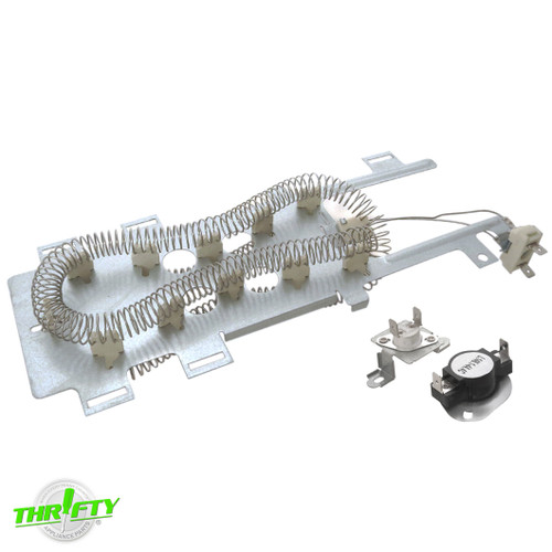 Replacement heating element and thermostat set used for some Amana, Inglis, Kenmore, Maytag, and Whirlpool dryer models.