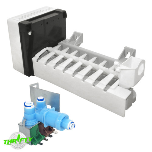 Replacement ice maker and water valve used for some Kenmore and Whirlpool refrigerator models.