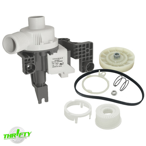 - Includes (1) APNW10876600 Pump and Motor Assembly, (1) Drive Pulley, (1) Basket Drive Gear, (1) Splutch Housing, (1) Cam Ring, (1) Spring, (1) Nut, (1) APNW10006384 5-Rib Multi-v Drive Belt.
